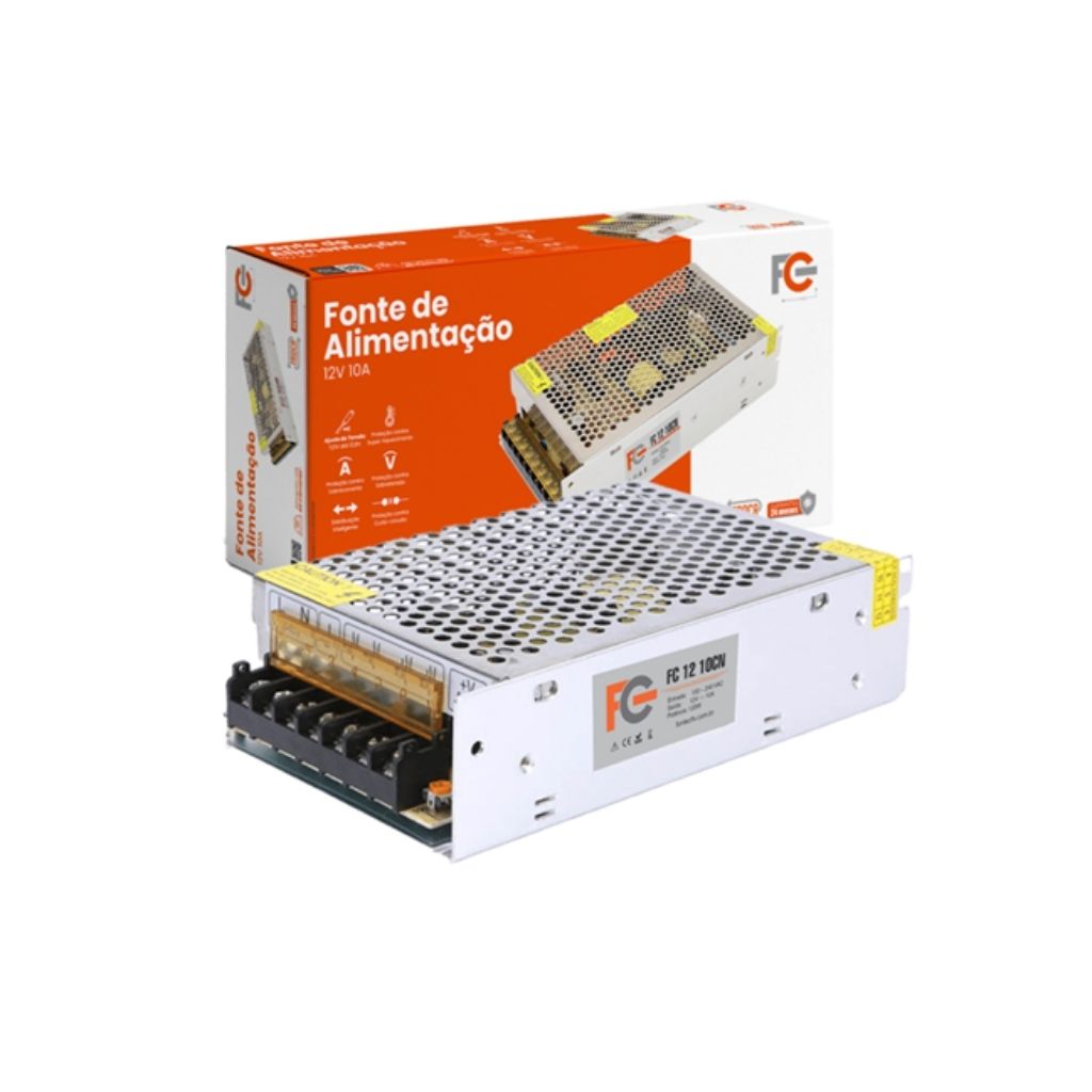 - Fonte de alimentação 12v 10a 120w para utilização em sistemas de Segurança Eletrônica e Fitas LED, com proteção contra curto circuito, aquecimento e sobre carga, proporcionando maior segurança. Alimenta até 32 câmeras com IR ligado e consumo máximo de 250 mA*.